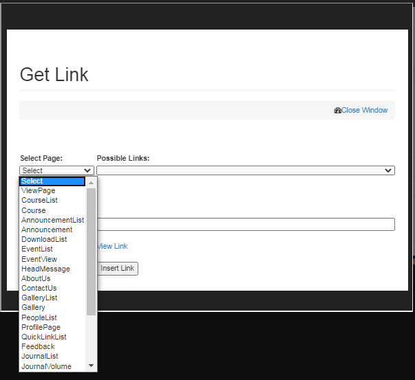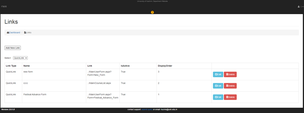 Select displays links which have been added to the website, by Choosing desired link (Quick Link, Download and Footer Link) from the drop down menu.